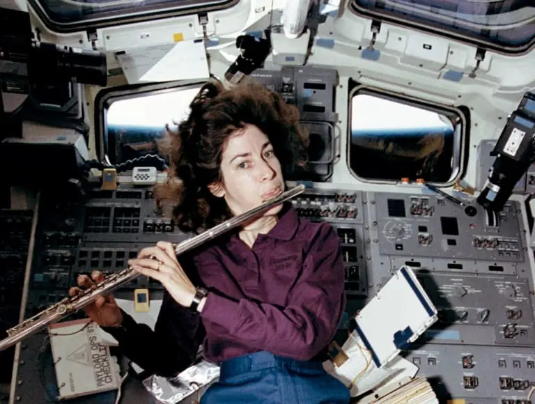 Astronaut Ellen Ochoa playing flute on space shuttle Discovery ©NASA